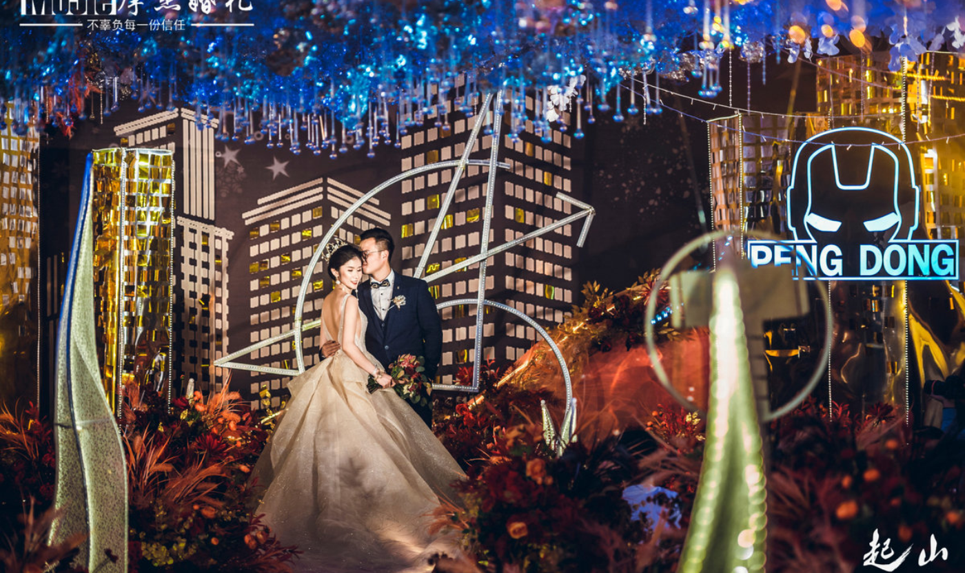 新郎新娘是漫威粉丝,他们向策划师提出了意图办一场漫威主题婚礼的想法。幸运的是,设计师邓子同样是一位深度漫威迷,对漫威第一个十年历程同样有着自己的理解和感情。 和新娘一拍即合,最终,决定用她沉迷过的漫威题材电影,赋予他们关于婚礼的无限灵感。也是因为两人爱好相同,越聊越投缘,新娘对我们也非常信赖。 那天在万狮京华举办一场盛大的婚礼,漫威主题婚礼,震撼了在场所有的人。 我们向往着漫威电影里的炫彩夺目,跳跃的宇宙色彩,大束的热烈捧花,闪烁的星光斑驳,与聚光灯下的主角,氤氲的气流中游荡着影片式激情的气味,这种感觉久久的消散不去,驻扎心底。 为了配合漫威风的宇宙色彩,金色的曙光灯闪耀着,点缀着饱满的花艺,作为路引,将来宾带入红黄与与宇宙色打造的神秘婚礼氛围中。 这次我们特意制造了整个漫威电影里的造景,象征梦境的缩影。[更多…]