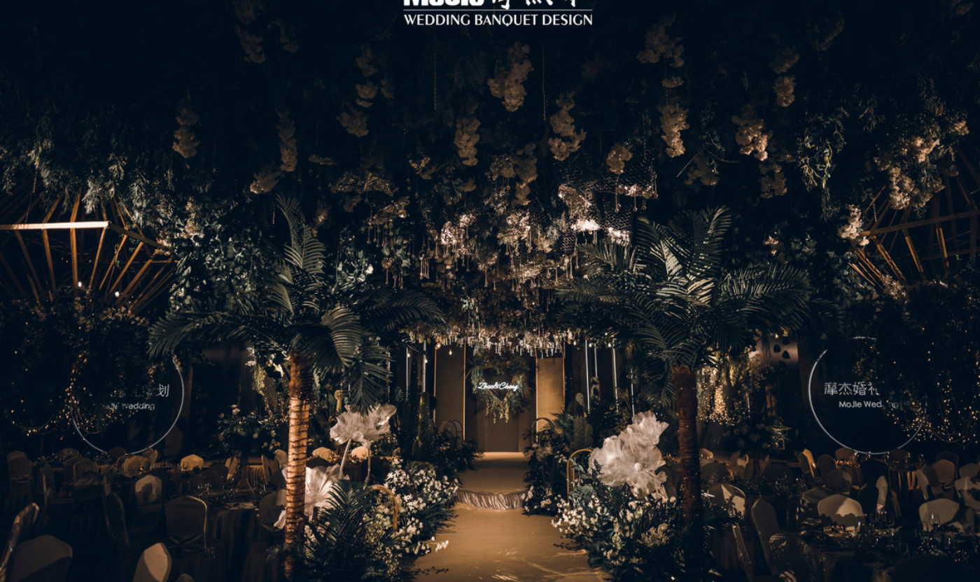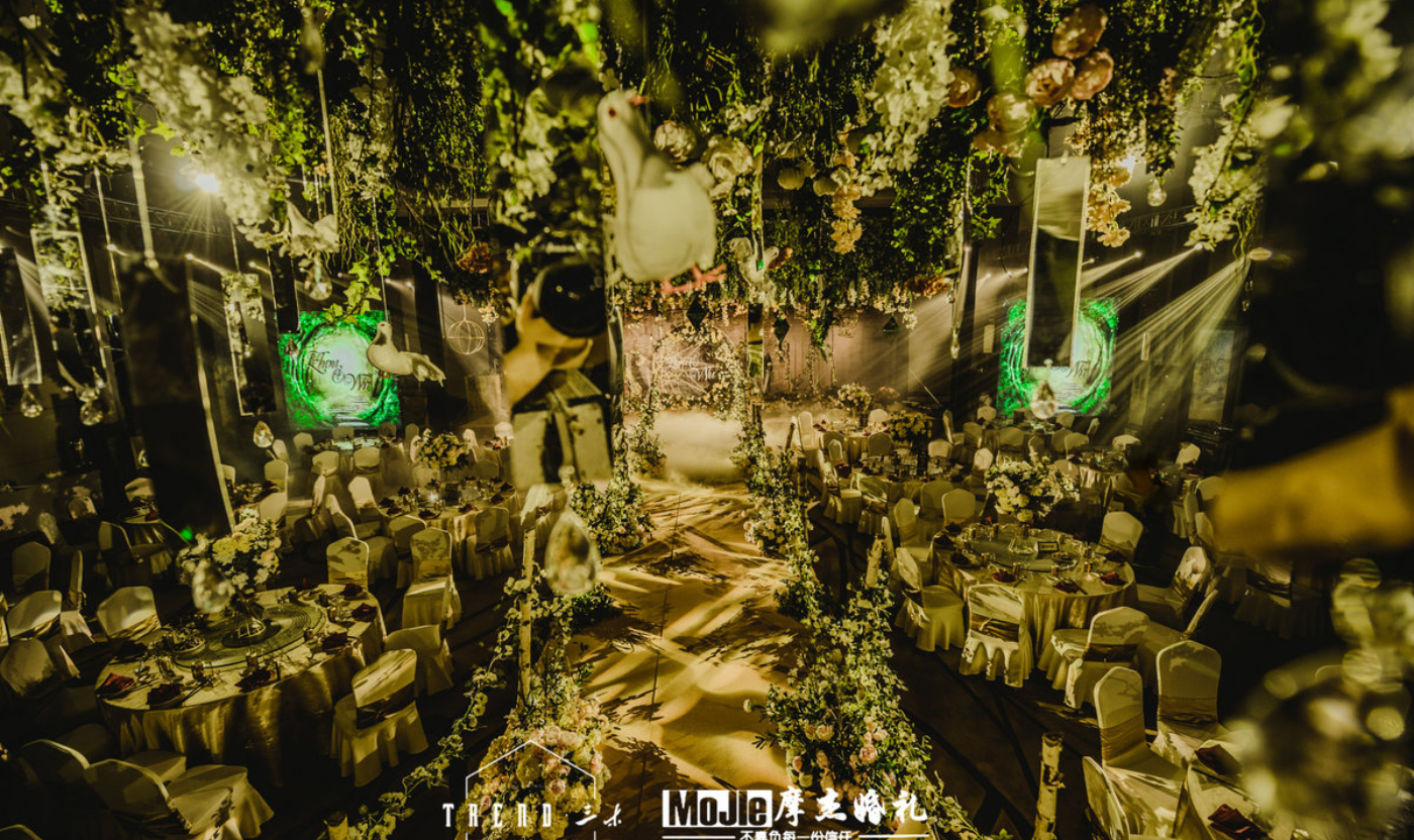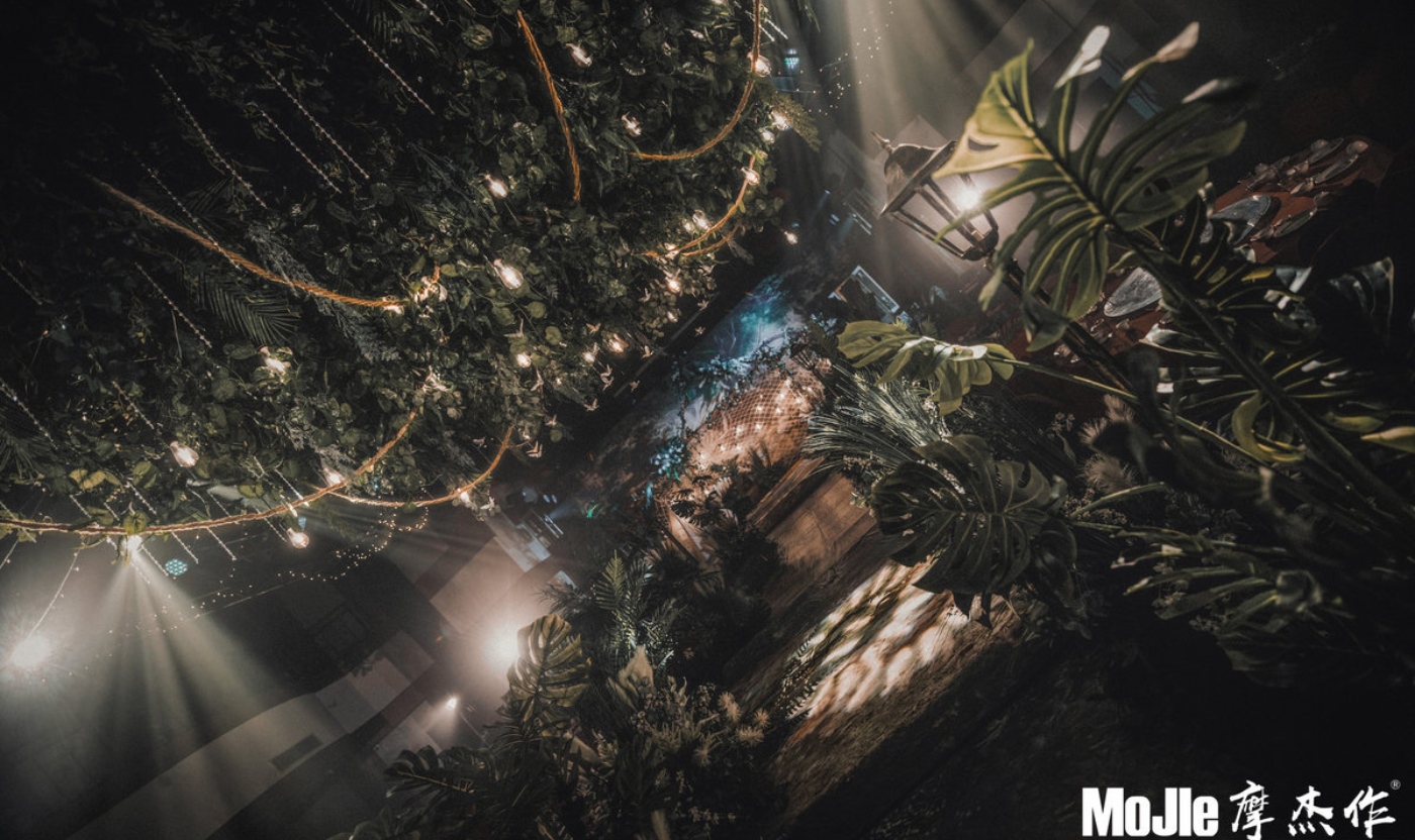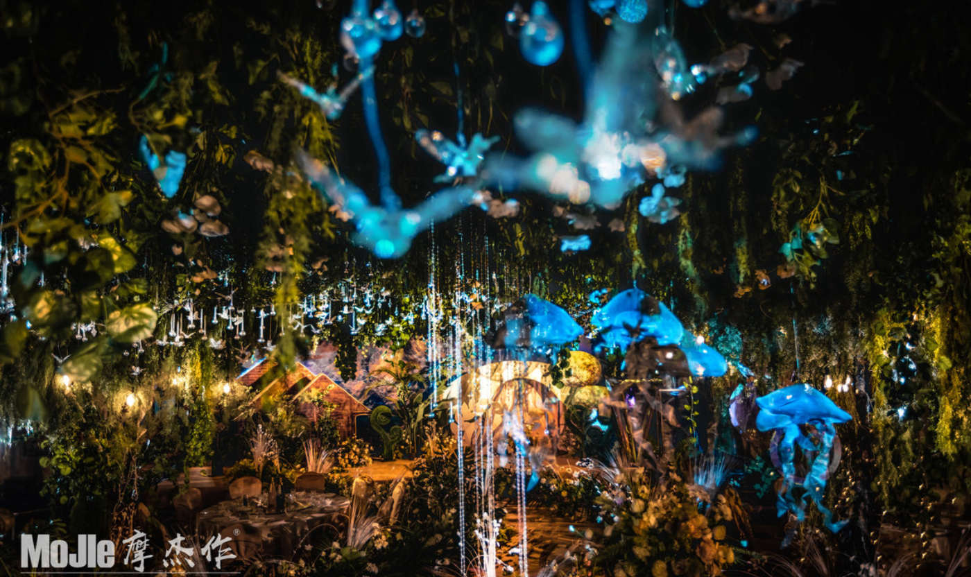 - BEFORE WEDDING - 写在前面 当爱情遇见森林,就变成了一花、一草、一树、一木。将爱情与生灵结合,最能体现出爱情的生机与美好。 还记得《暮光之城4:破晓》中上演的那场森系婚礼是当之无愧的最经典森林风格的婚礼,主人公爱德华和贝拉有情人终成眷属,他们在繁茂而神秘的丛林深处举行了盛大隆重的森林婚礼,最终步入婚礼殿堂。 泰戈尔有诗道:在你的乌黑的眼睛里的热情卷扫的影子,像那在暮色中寻找归巢的倦鸟的影子。每个女孩都有自己的婚礼梦,这场婚礼的新人共同经营了一家宠物店,并豢养了三只泰迪狗,对自然及生灵的偏爱成为新娘对自己婚礼的最大诉求。于是这一次,摩杰作为新人打造了一个生机奇幻的无尽森林。 关键词:生灵 奇幻 星光 森林 提到森系,想到的自然是神秘而高雅的墨绿色搭配橡树棕,但这次,设计师打破常规对森系婚礼的认知,用不同层次的绿植搭配花材、亮色造型吊装以及灯光,打造了一片名副其实的奇幻森林,看那片忽明忽暗的地方,是萤火虫在煽动翅膀。[更多…]