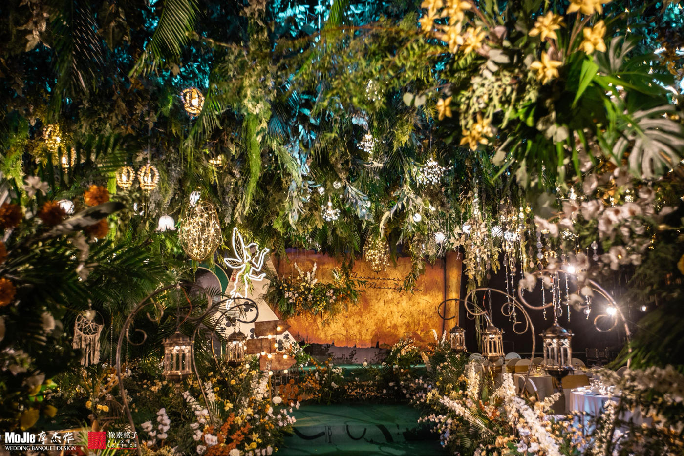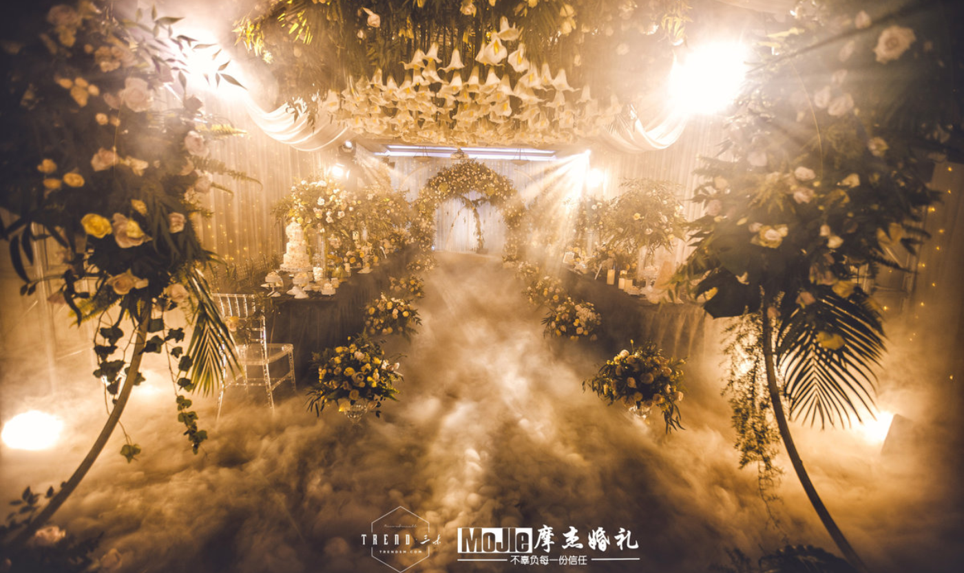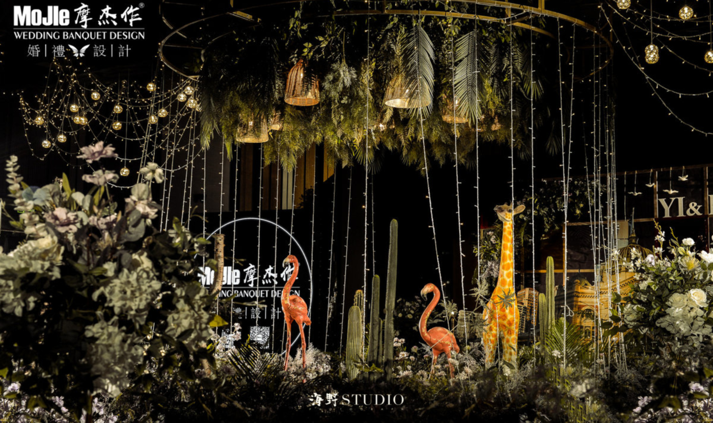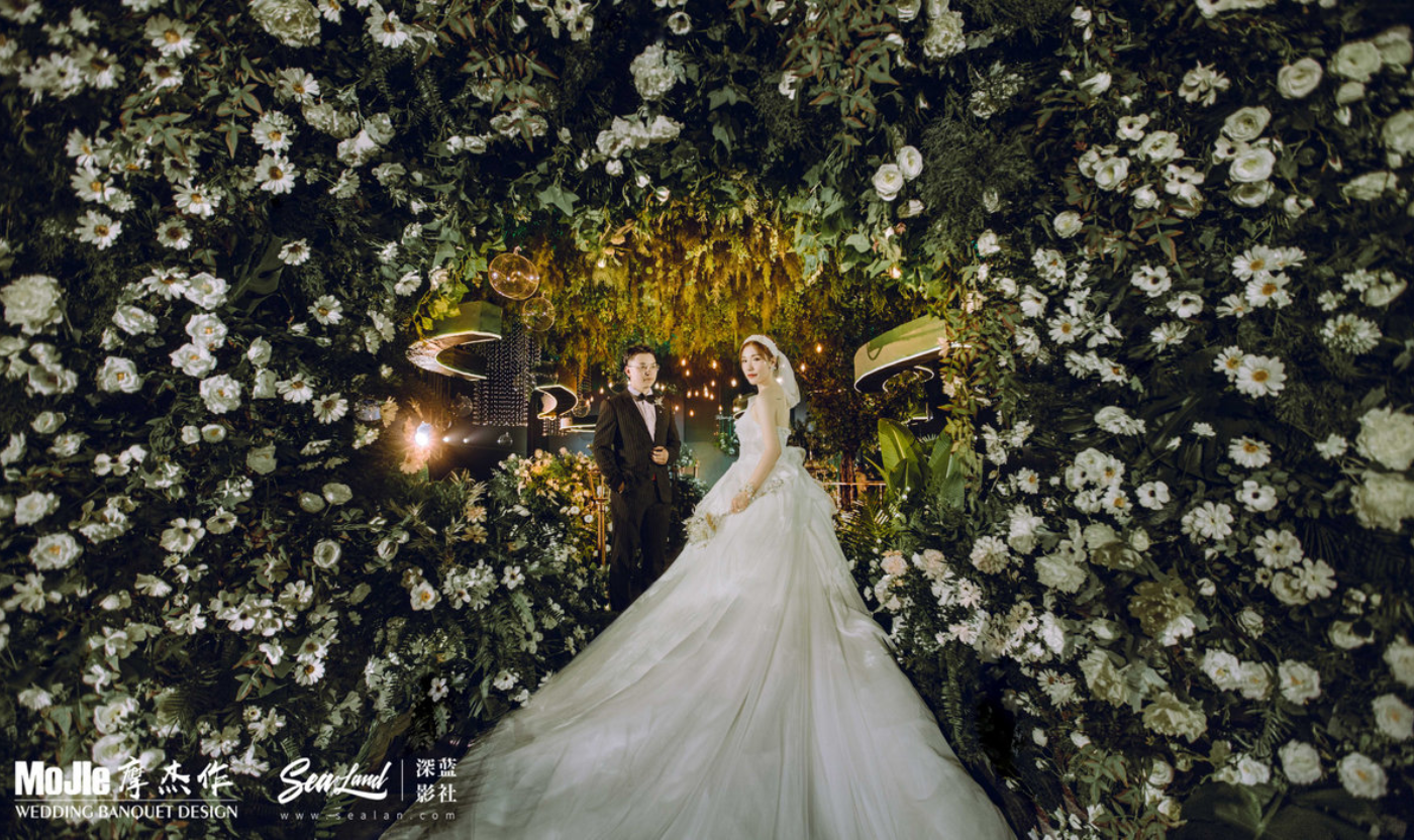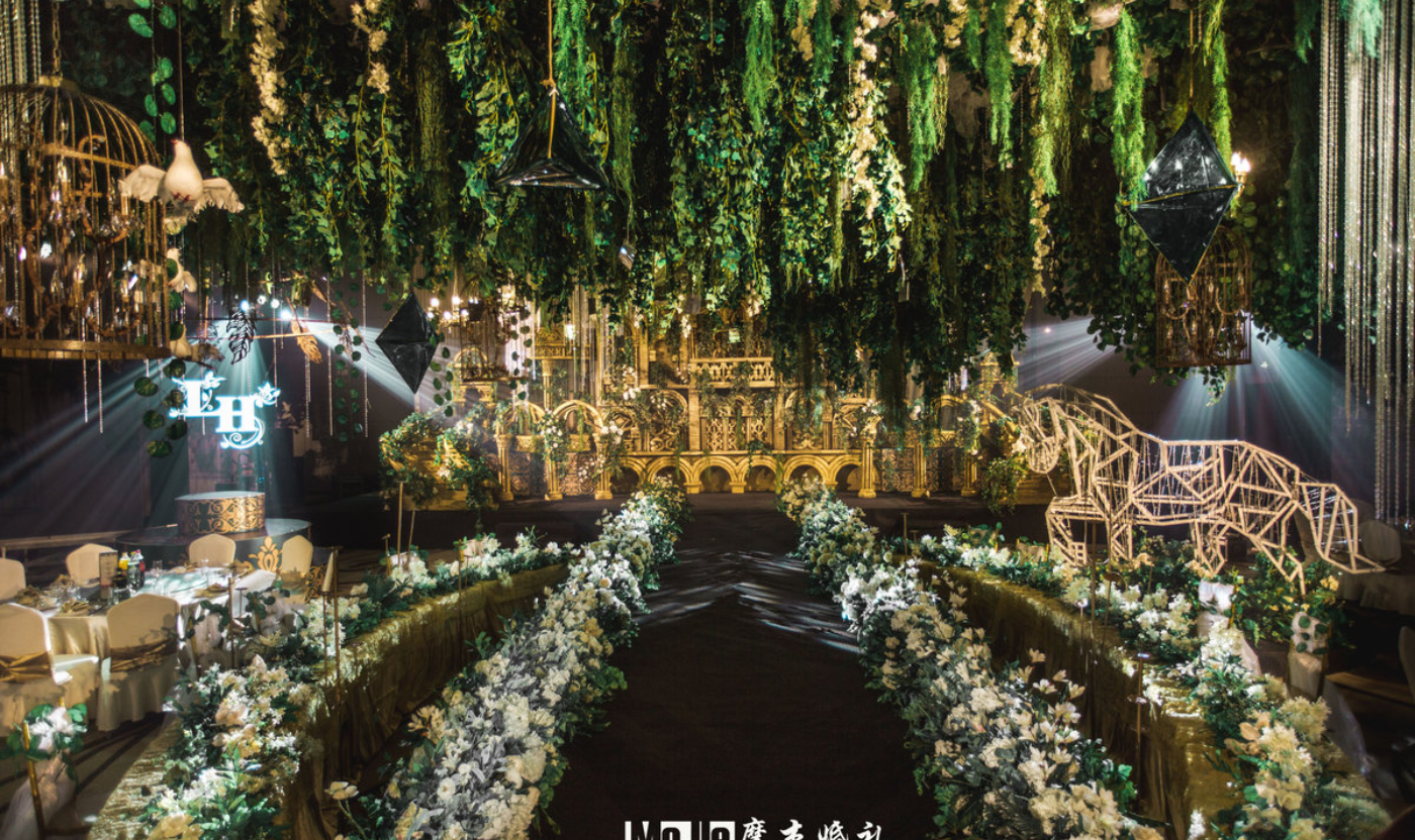 - BEFORE WEDDING - 写在前面 当爱情遇见森林,就变成了一花、一草、一树、一木。将爱情与生灵结合,最能体现出爱情的生机与美好。 还记得《暮光之城4:破晓》中上演的那场森系婚礼是当之无愧的最经典森林风格的婚礼,主人公爱德华和贝拉有情人终成眷属,他们在繁茂而神秘的丛林深处举行了盛大隆重的森林婚礼,最终步入婚礼殿堂。 泰戈尔有诗道:在你的乌黑的眼睛里的热情卷扫的影子,像那在暮色中寻找归巢的倦鸟的影子。每个女孩都有自己的婚礼梦,这场婚礼的新人共同经营了一家宠物店,并豢养了三只泰迪狗,对自然及生灵的偏爱成为新娘对自己婚礼的最大诉求。于是这一次,摩杰作为新人打造了一个生机奇幻的无尽森林。 关键词:生灵 奇幻 星光 森林 提到森系,想到的自然是神秘而高雅的墨绿色搭配橡树棕,但这次,设计师打破常规对森系婚礼的认知,用不同层次的绿植搭配花材、亮色造型吊装以及灯光,打造了一片名副其实的奇幻森林,看那片忽明忽暗的地方,是萤火虫在煽动翅膀。[更多…]