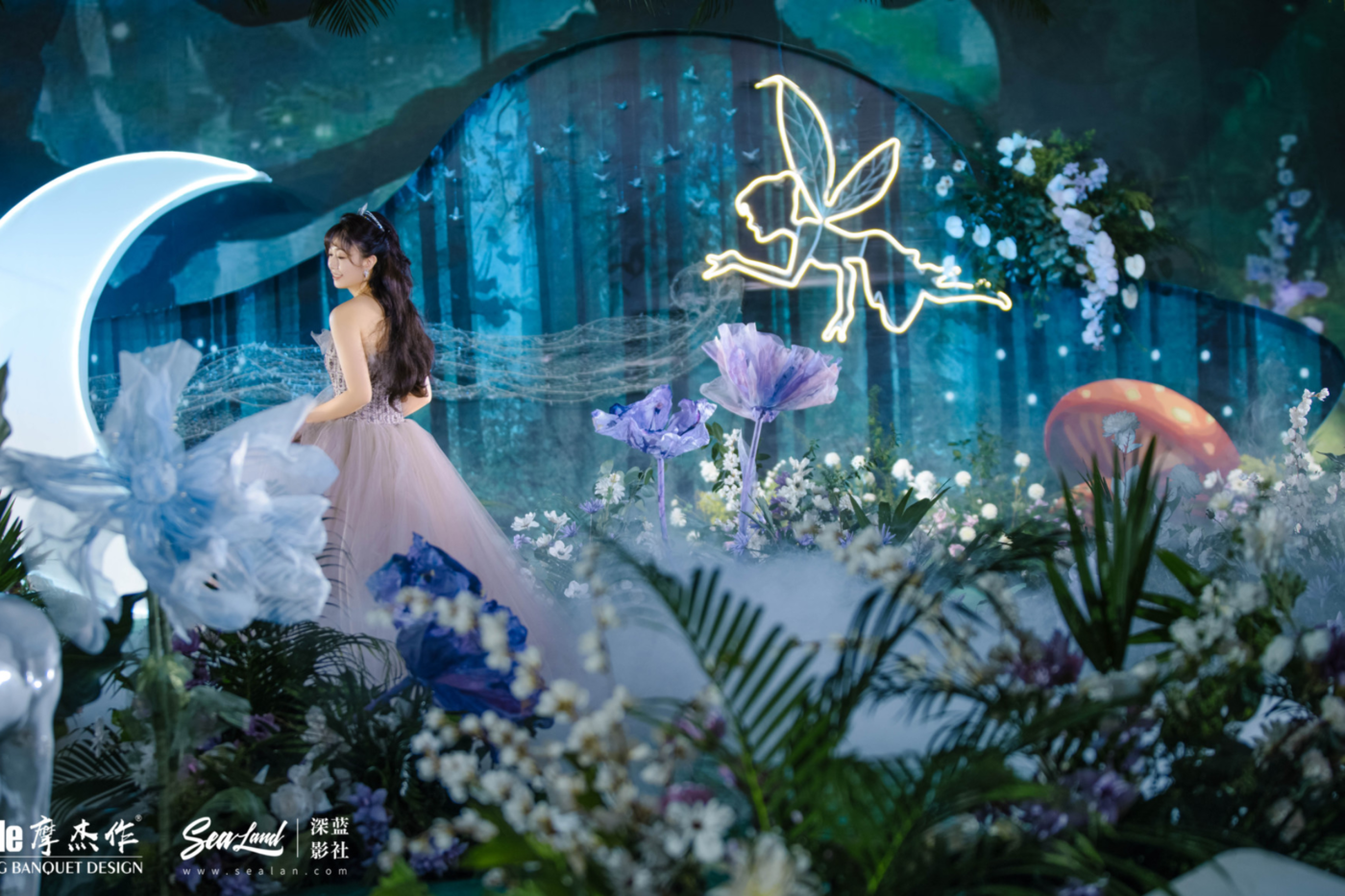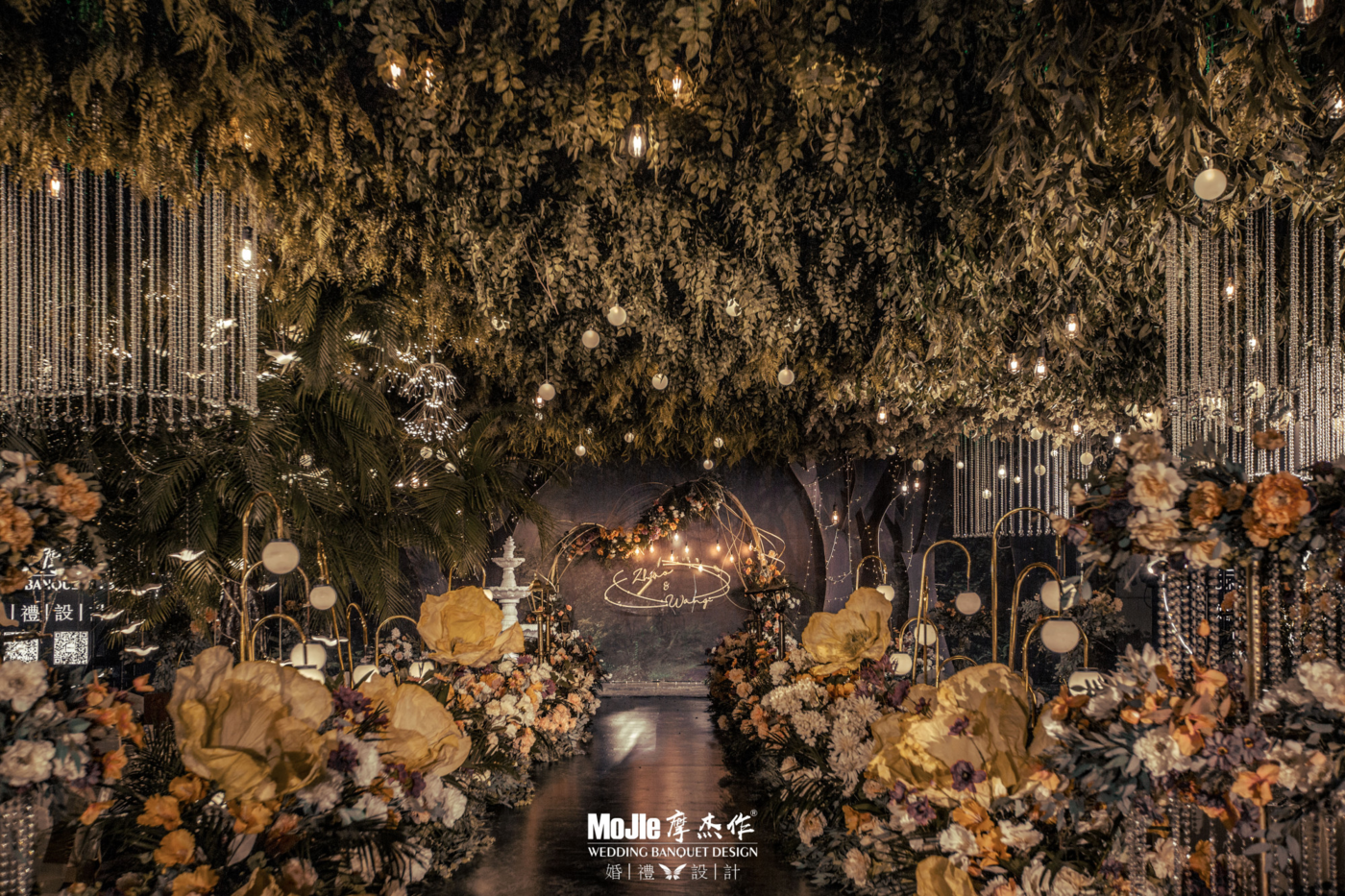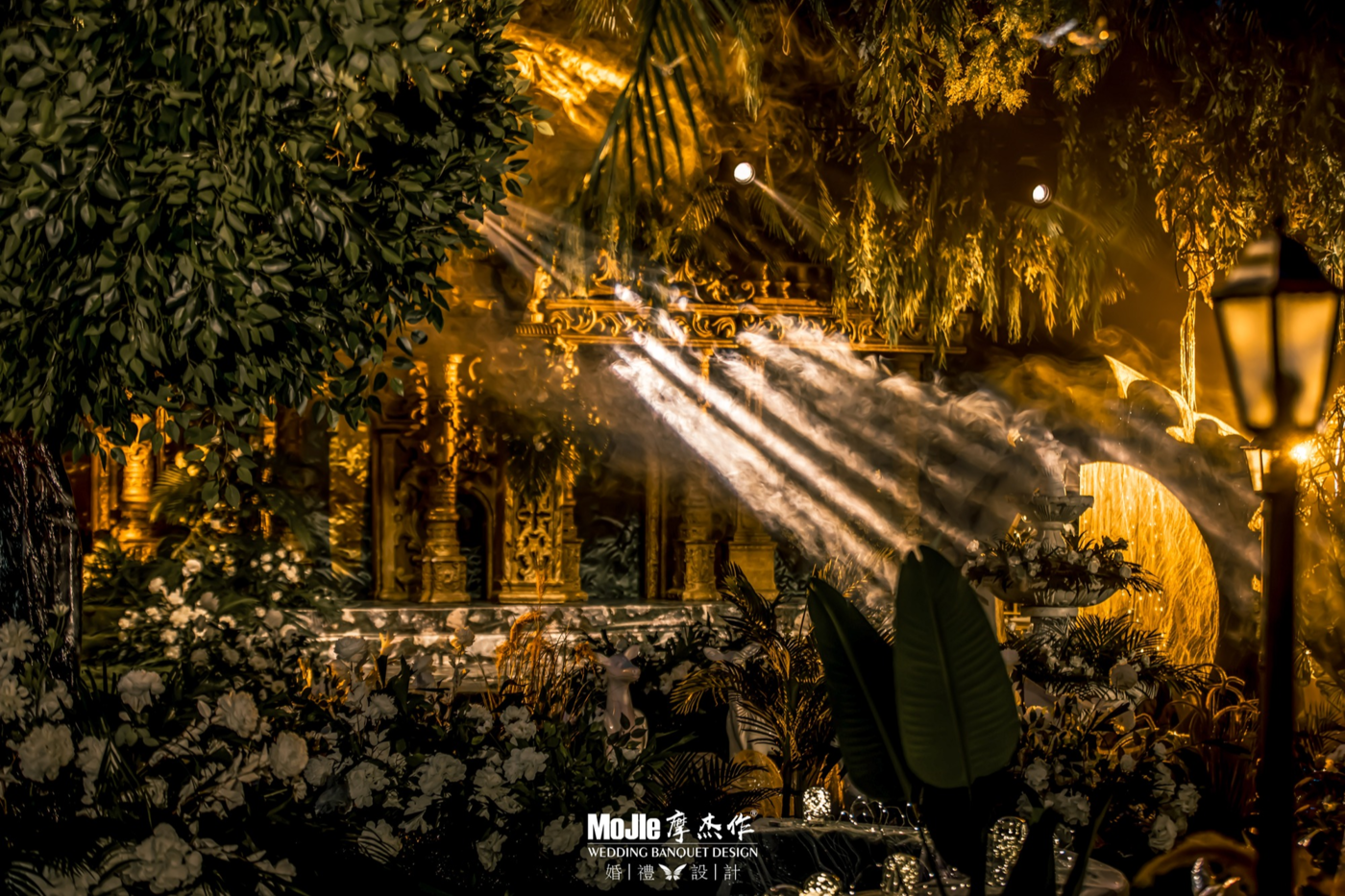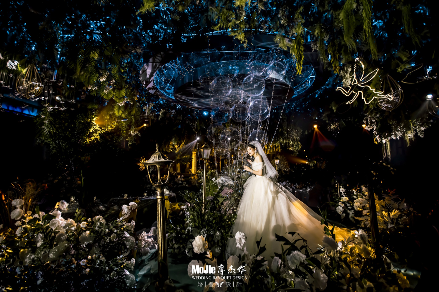 - BEFORE WEDDING - 写在前面 当爱情遇见森林,就变成了一花、一草、一树、一木。将爱情与生灵结合,最能体现出爱情的生机与美好。 还记得《暮光之城4:破晓》中上演的那场森系婚礼是当之无愧的最经典森林风格的婚礼,主人公爱德华和贝拉有情人终成眷属,他们在繁茂而神秘的丛林深处举行了盛大隆重的森林婚礼,最终步入婚礼殿堂。 泰戈尔有诗道:在你的乌黑的眼睛里的热情卷扫的影子,像那在暮色中寻找归巢的倦鸟的影子。每个女孩都有自己的婚礼梦,这场婚礼的新人共同经营了一家宠物店,并豢养了三只泰迪狗,对自然及生灵的偏爱成为新娘对自己婚礼的最大诉求。于是这一次,摩杰作为新人打造了一个生机奇幻的无尽森林。 关键词:生灵 奇幻 星光 森林 提到森系,想到的自然是神秘而高雅的墨绿色搭配橡树棕,但这次,设计师打破常规对森系婚礼的认知,用不同层次的绿植搭配花材、亮色造型吊装以及灯光,打造了一片名副其实的奇幻森林,看那片忽明忽暗的地方,是萤火虫在煽动翅膀。[更多…]