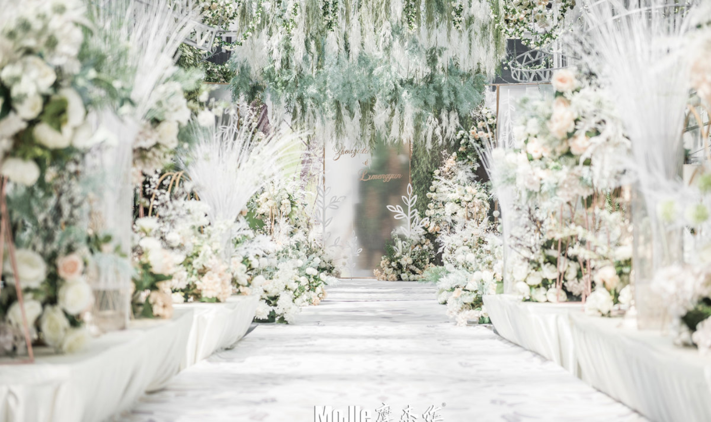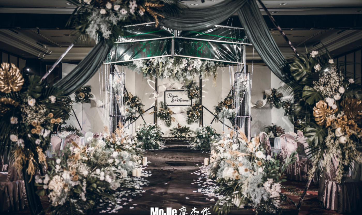 这是一场完完全全的花房婚礼 摩杰再一次进行了婚礼场地大改造 我们直接在酒店里打造了一座玻璃花房 透明/阳光/花香/最重要的人 春风夏雨/阳光雨露 一切都那么真实而又梦幻 一场在酒店中举办的婚礼,结合酒店实景设计改造而成,最大的难题莫过于规避那些无法搬离现场的杂物。比如场地原有的铁艺花亭。这时候,“花”成了我们手中最好的修饰画笔,我们用“花”改变了酒店全厅原来的面貌。如你看到这般,华丽的舞台藏匿在繁花深处,低调却别有洞天。 高级感,是CC写这篇文章时脑海中不断涌现的一个词。从平面设计、字体选用,到桌型摆放、桌布与花材的材质挑选...你会看到丰富的细节,不管是立体线条,还是背景,处处都体现了设计师的巧思以及对高级感的追求。这场婚礼场地大改造,以灰白、樱草绿、茶青色为整体基调。可以说现场的每个细节都值得慢慢去品。受限于手机屏幕尺寸,照片无法将细节和质感像肉眼看到的那般呈现出来,但这不妨碍我们细细欣赏每张照片。 有生气/有活力/还要有阳光的 就和她平常的生活一样 西式/花园//party 情调满满 是婚礼 也是生活 春夏之交的五月,静谧、温柔且浪漫,暖暖的阳光️透过枝叶的缝隙洒落下来,飞絮在空气中漫无目的起舞。我们不仅拍摄了阳光版本的视频和照片。还拍摄了夜间下的模样。 当光影穿透叶脉散落周围,衬出恰到好处的明媚光芒,这抹初夏色如精灵般灵动,为暗夜里带来生机与宁静,潜藏的风景由茶青色和草绿色组合成诗,还原最纯粹的婚礼。[更多…]