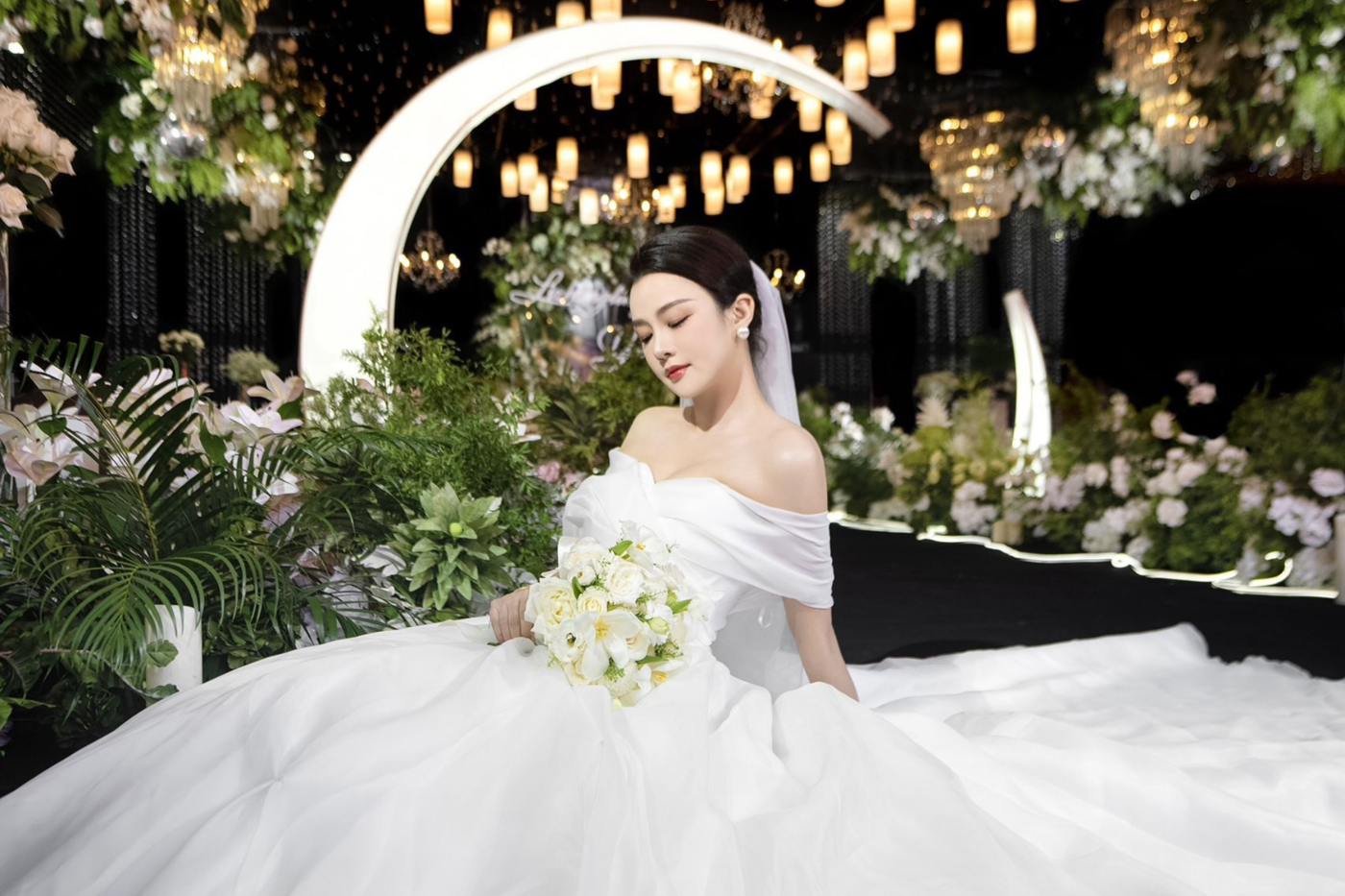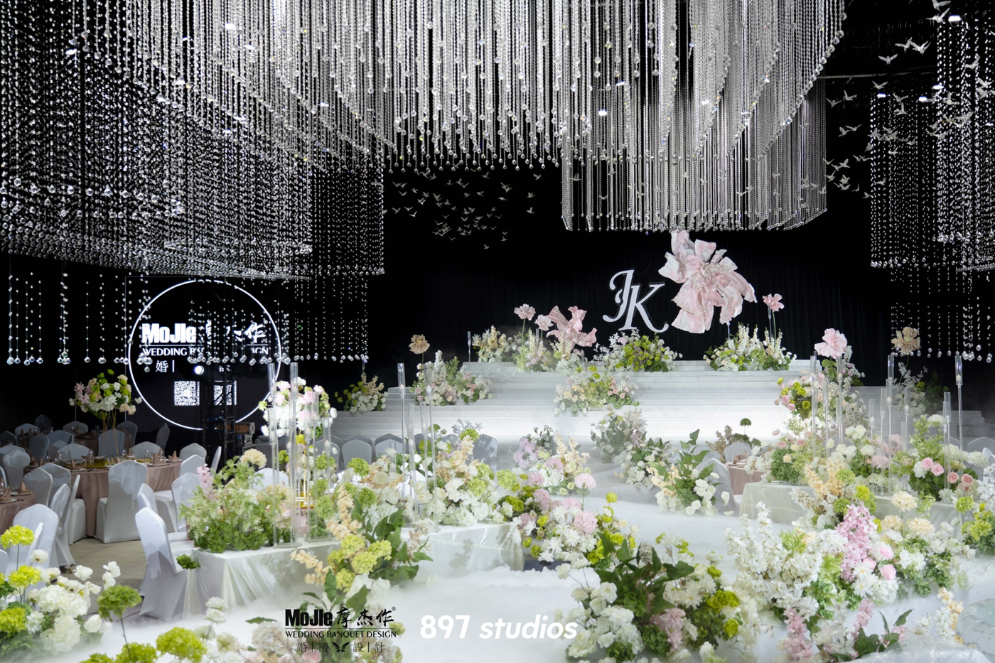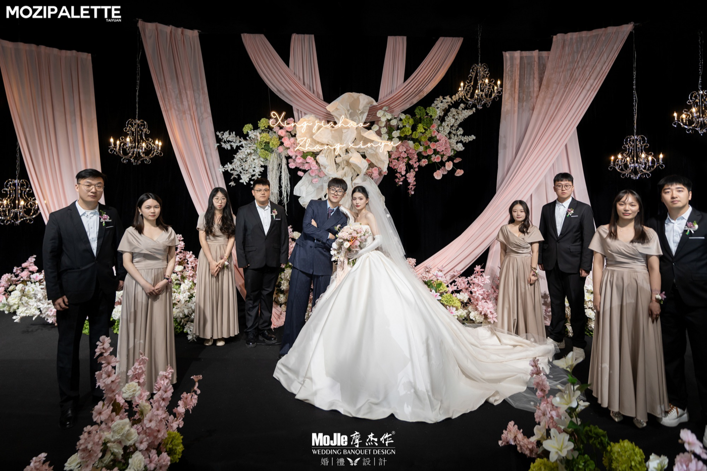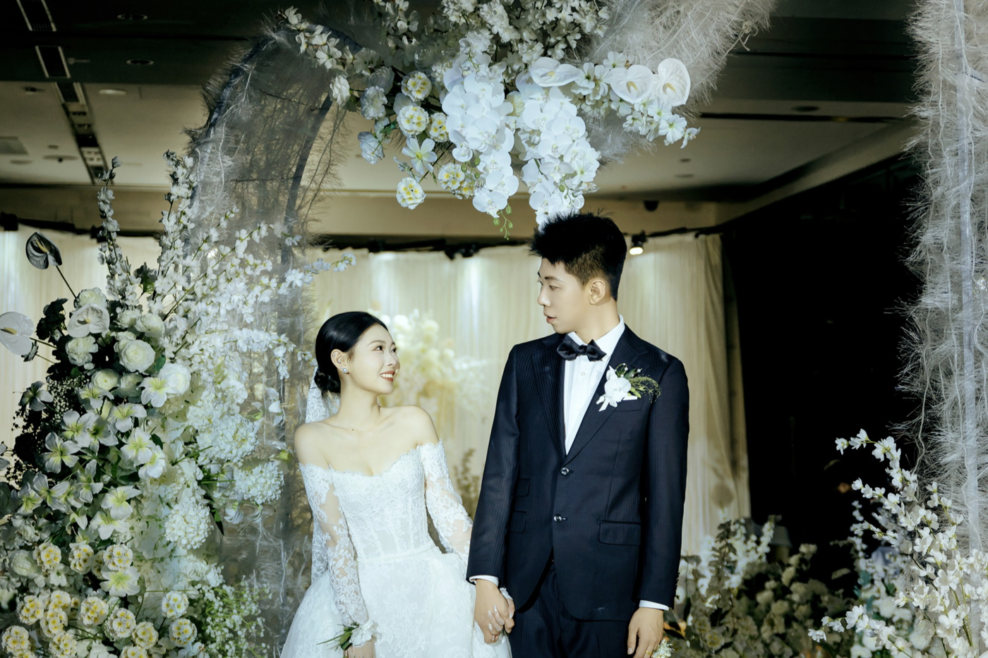 我们还原了最经典的韩式婚礼。柔软丝滑的布幔、自然系鲜花、水晶灯、花瓣以及舞台两边的萤火蜡烛都是韩式婚礼的必备元素。而一场高级有质感的韩式婚礼也需要恰如其分的花艺搭配。 交接区的鲜花拱门是韩式婚礼的标志性区域也是新人最喜爱的的区域。以粉色、白色为主的鲜花搭配绿植,让韩式婚礼更高级淡雅有氛围感。[更多…]