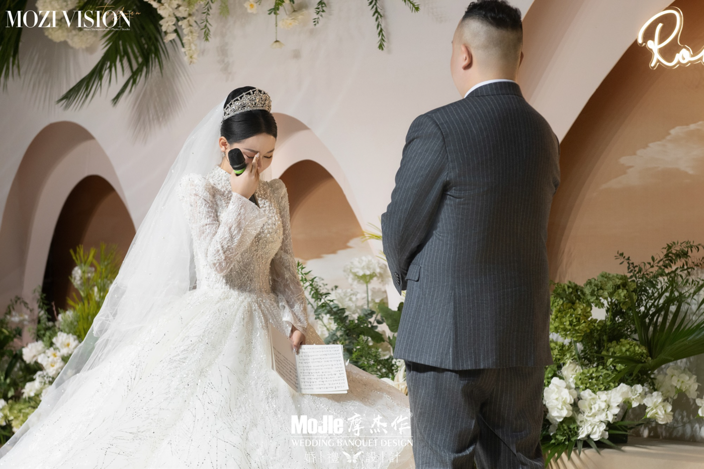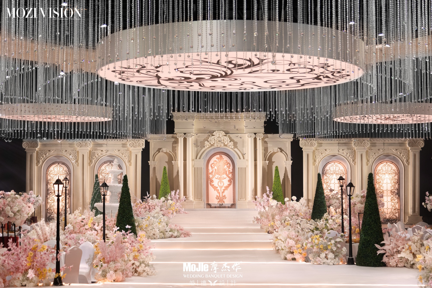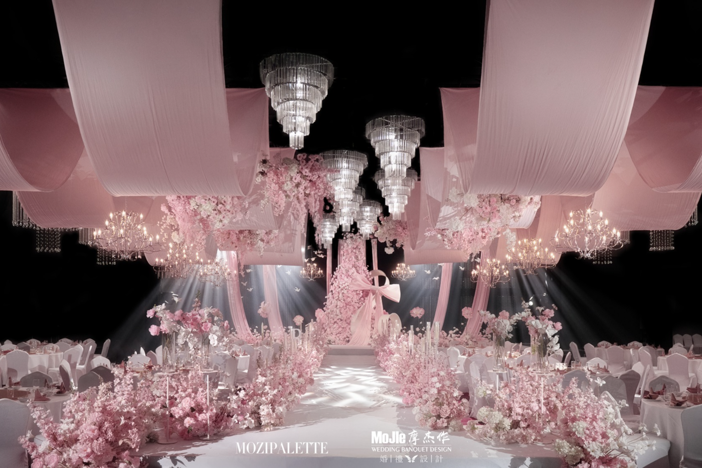婚礼以蜜桃粉为基调,与粉调豆沙相映衬, 柔软的色调像一杯充满蜜桃芳香的果茶,让婚礼充盈着蜜桃味的香甜, 撇去浮华的修饰,简单的几何契合温柔的线条,堆砌出澄明空灵的空间,散发着恬美的少女香气, 地面的馥影拉升出更透亮广阔的视野,水波纹路的亮闪珠帘,似盛着梦幻的糖果罐 ,藏满陷落的甜蜜。[更多…]