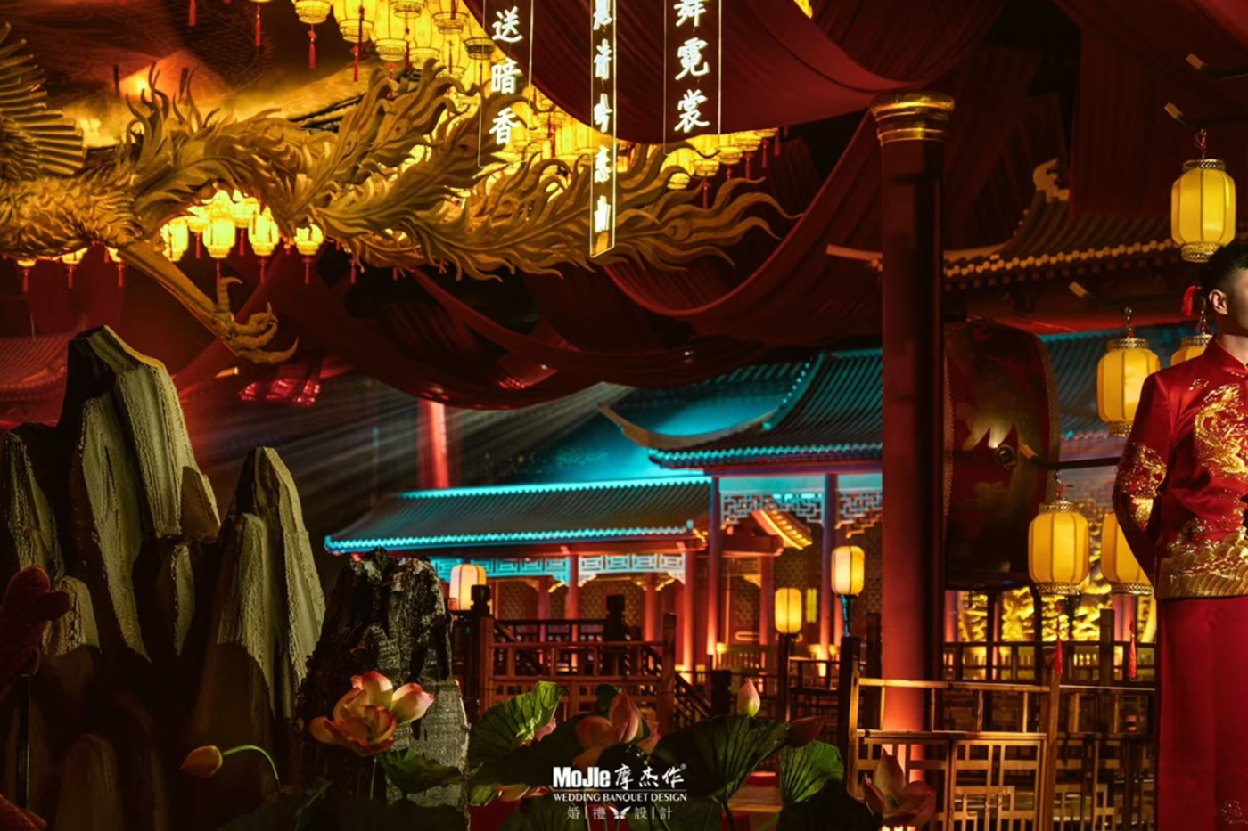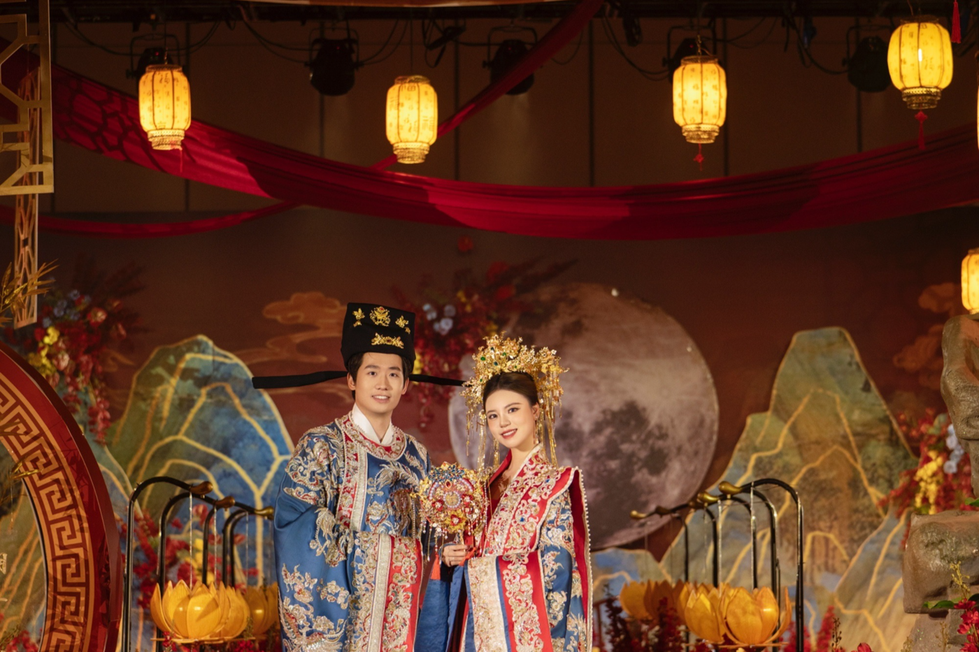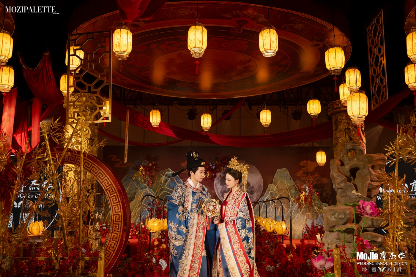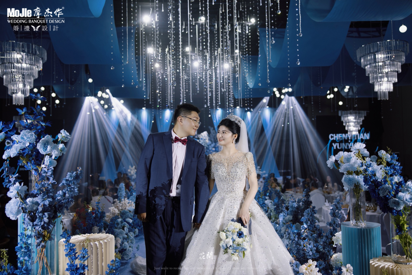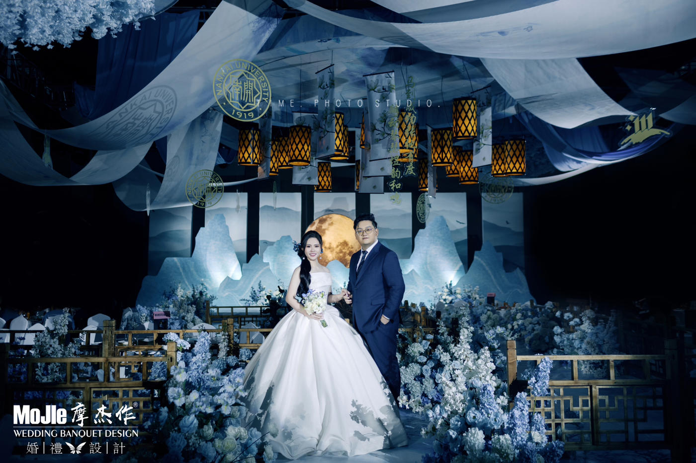 打破传统中式红金色的色调, 以中式蓝色山水画笔触与现代感相融合, 勾勒出本场婚礼独特的清丽气质。 浸百盏灯笼余温, 难挡穿越般意境。[更多…]